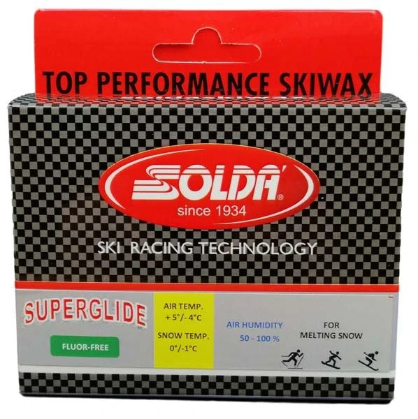 Fluor-free top level skiing glider developed for melting snow and air humidity 50-100% at snow temperature 0°/-1°C and air temperature +5°/-4°C.