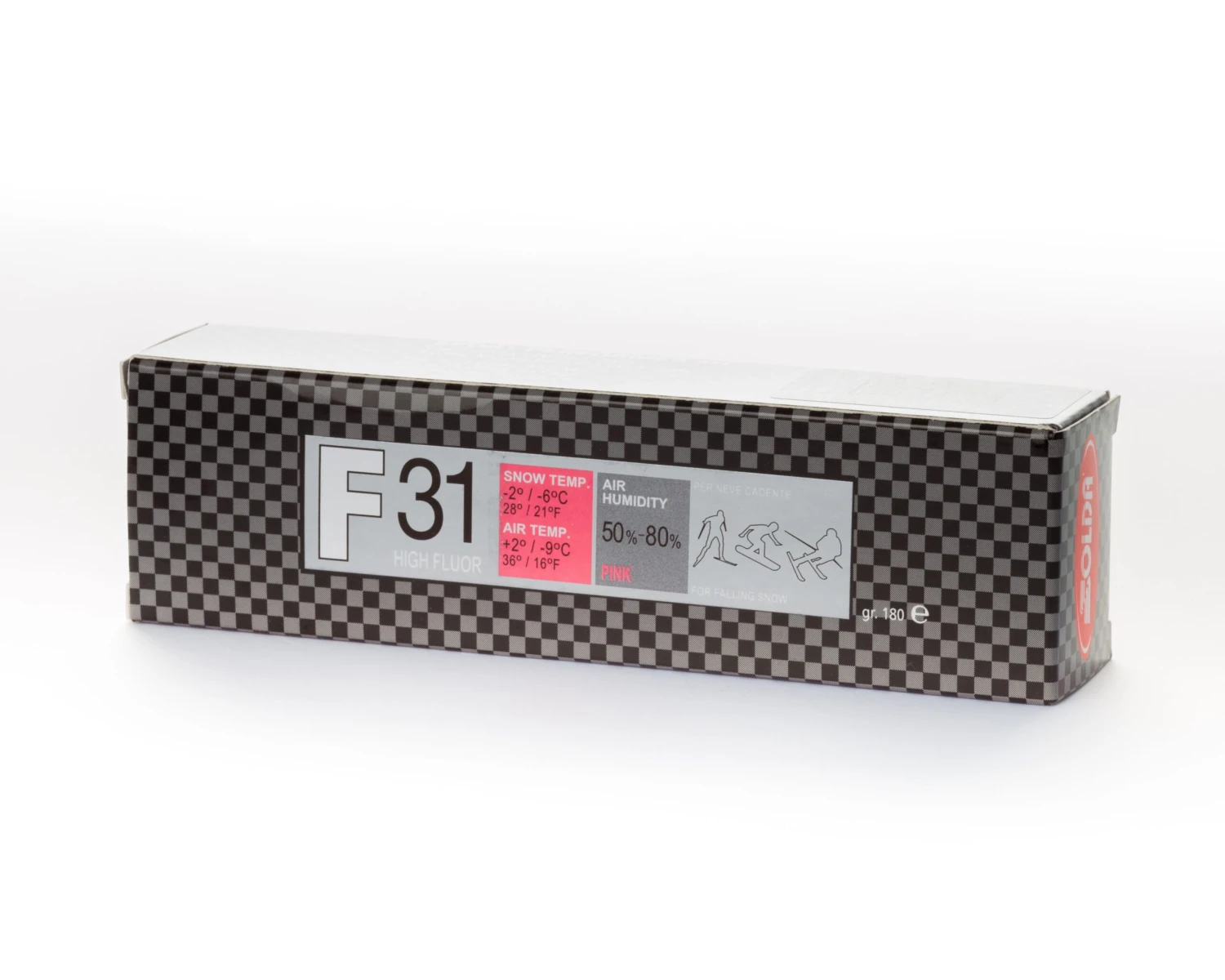 Pink high fluor glide wax is to be used for falling snow at snow temperature -2°/-6°C and air temperature +2°/-9°C.